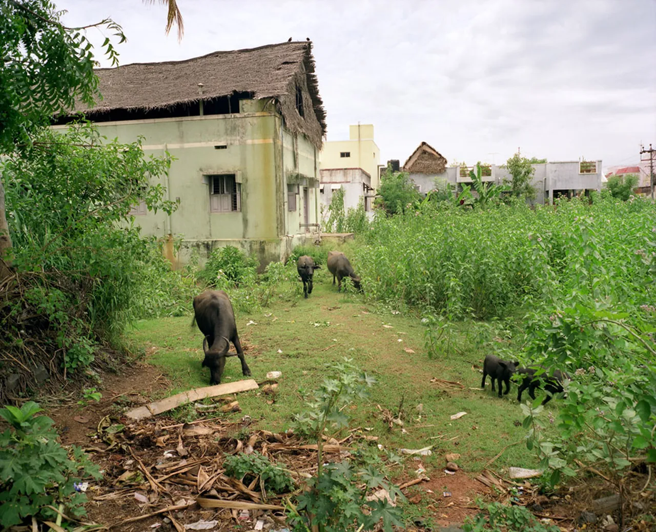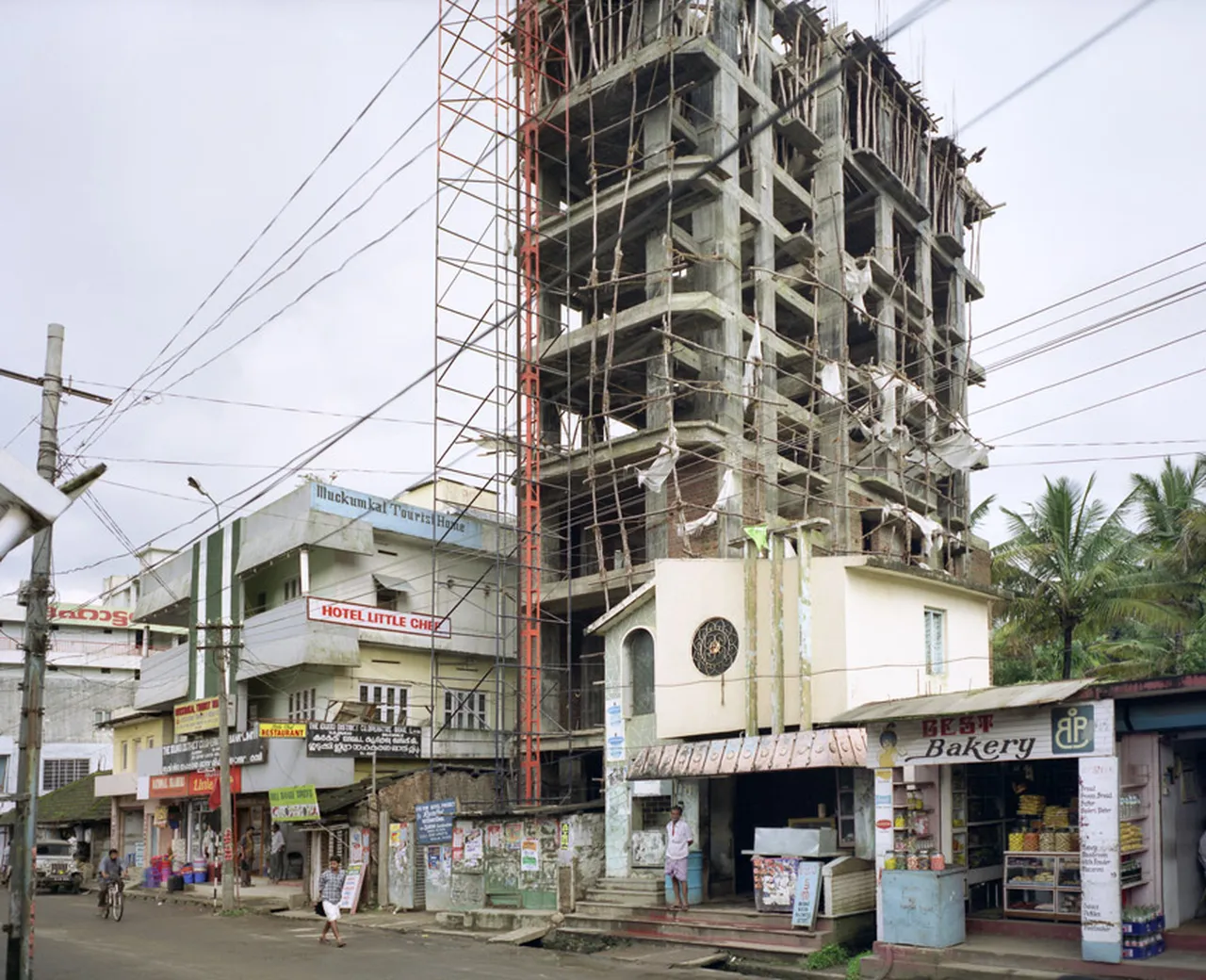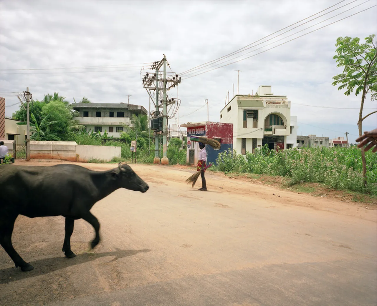 Unfinished buildings, animals, streets, temples and people in southern India.